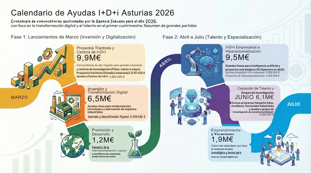 El Gobierno de Asturias ha presentado el calendario de convocatorias de I+D+i y desarrollo empresarial para 2026, que movilizará 42,7 millones de euros a través de 24 líneas de ayudas. Aumenta en casi cuatro millones la financiación destinada al crecimiento del tejido productivo y al impulso de la investigación, la atracción de talento y la innovación con respecto al año 2025.